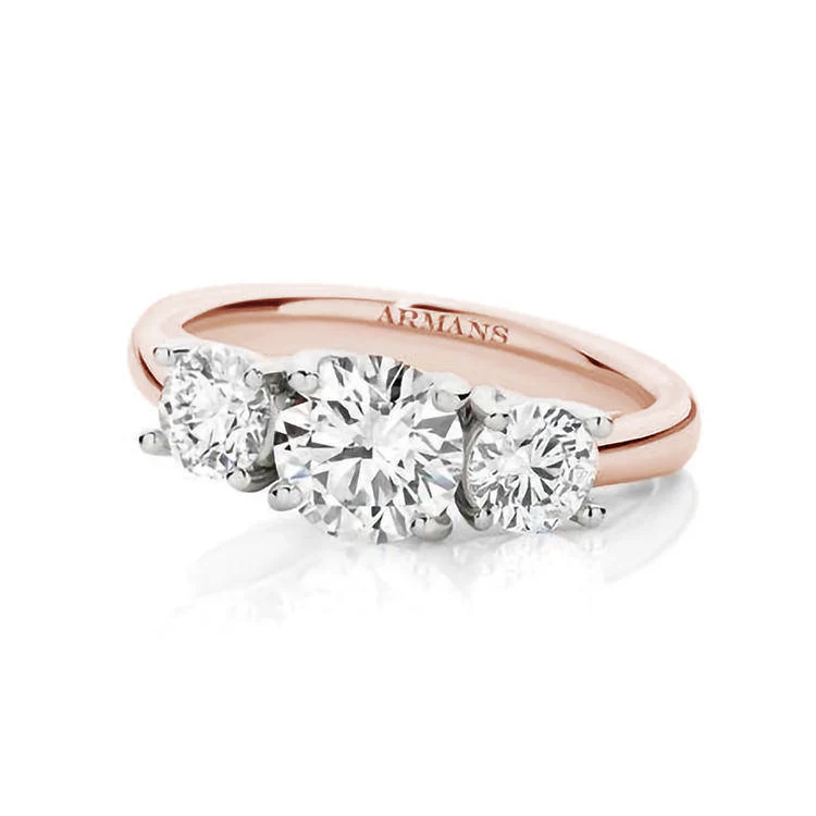 - 1.1ct round brilliant diamond with 2 x 0.4ct round brilliant side stones.Â