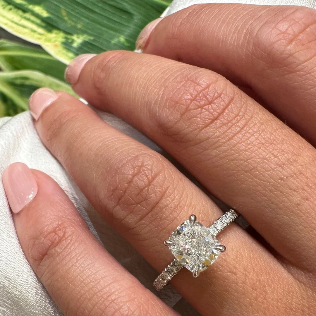 - Cushion cut diamond in a four-prong setting.