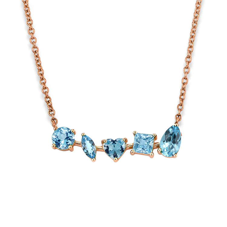Dive into style with our Multi-Shaped Aquamarine Bar Necklace! Adorned with a blend of round, marquise, heart, princess, and pear shaped aquamarines, this necklace is a must-have for any fashion-forward individual. Perfect for adding a touch of playfulness to any outfit.